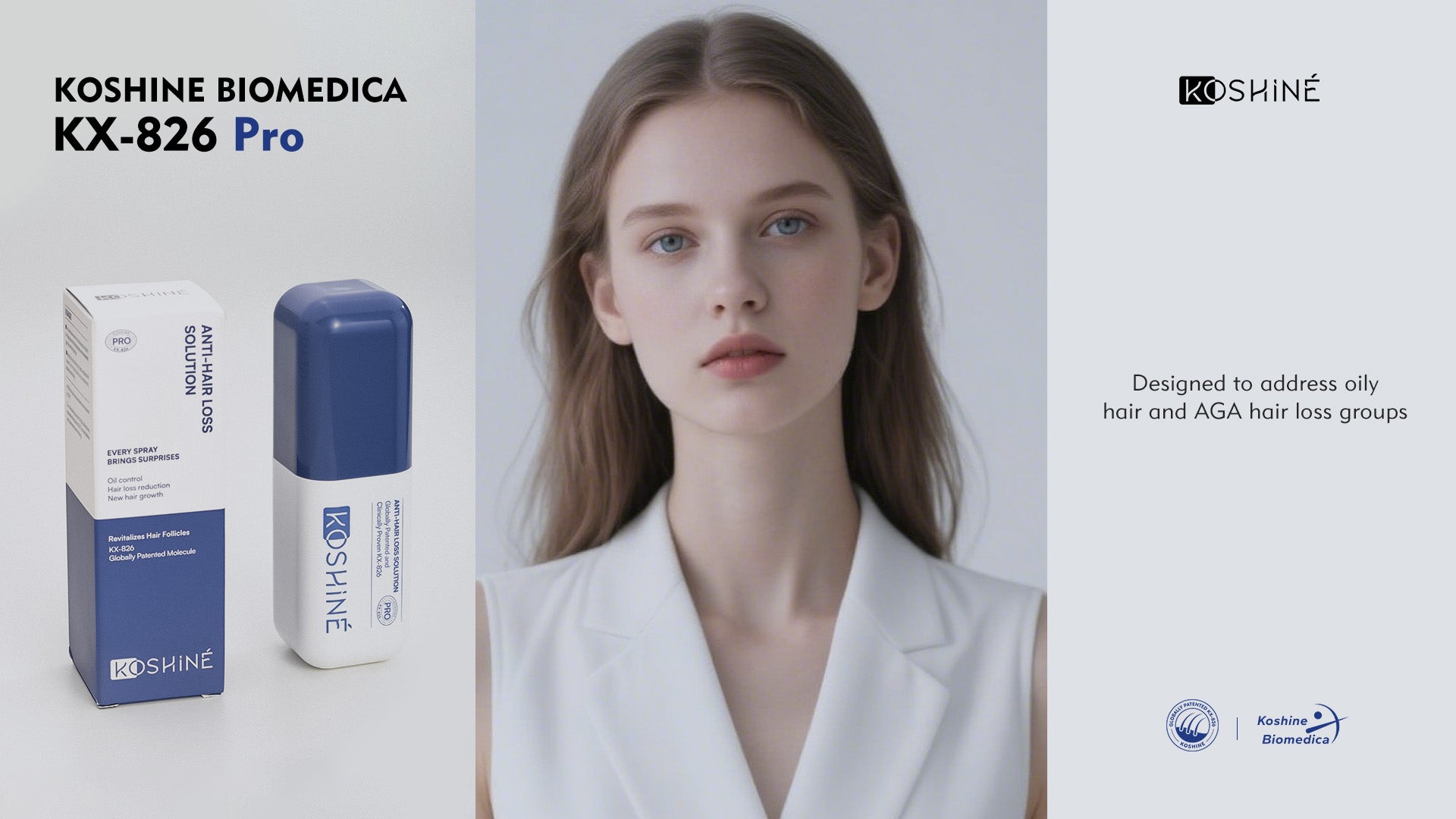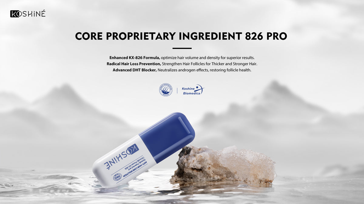 KOSHINÉ's core patented ingredient 826 has demonstrated excellent safety and efficacy in clinical research trials and can effectively improve oily hair, hair loss, and baldness. Continuous use can regulate and extend the growth cycle of hair follicles and build a healthy hair foundation.