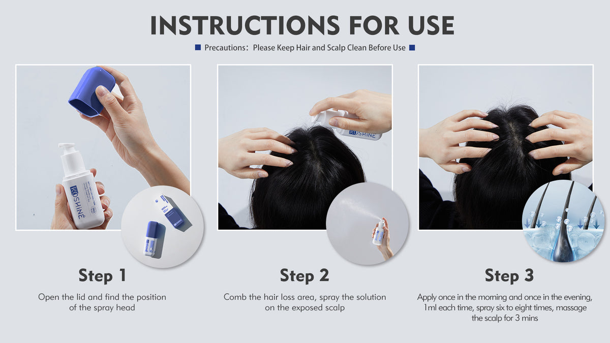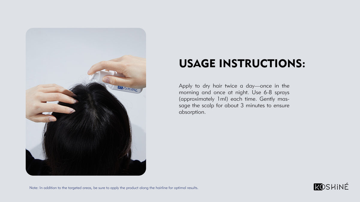 - Spray 6-8 times, about 1ml each time, and massage the scalp for 3 minutes.
