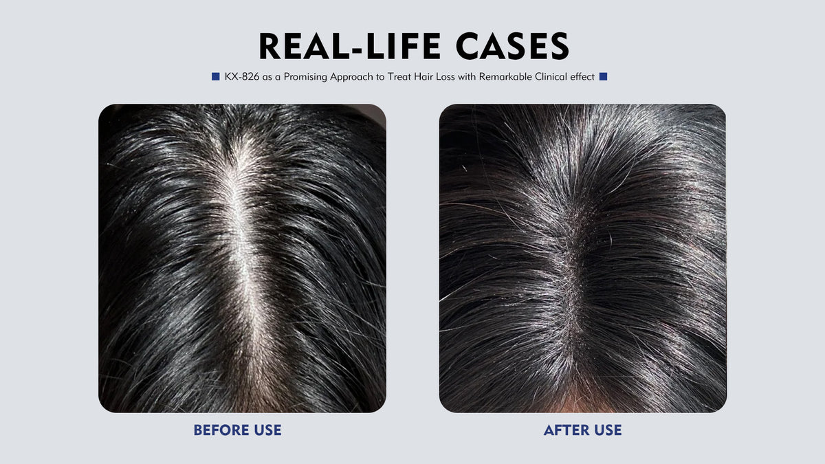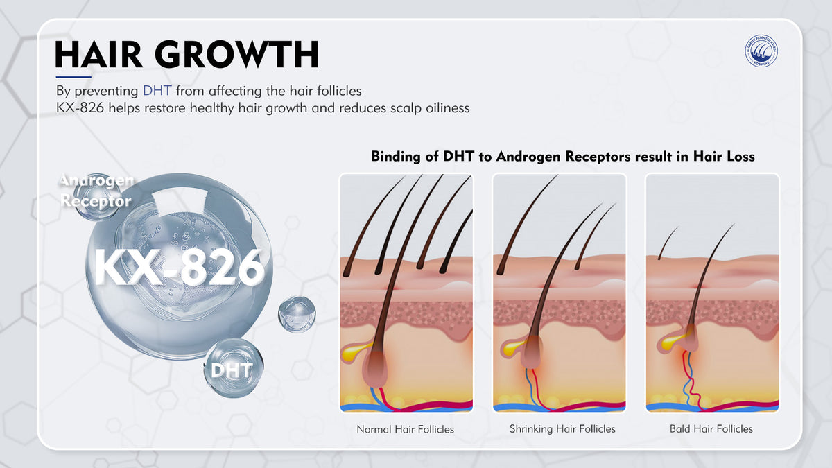 The core ingredient, 826, competes with dihydrotestosterone (DHT) for androgen receptor binding, inhibiting its impact. This restores the health of hair follicle cells, promoting healthier hair growth.