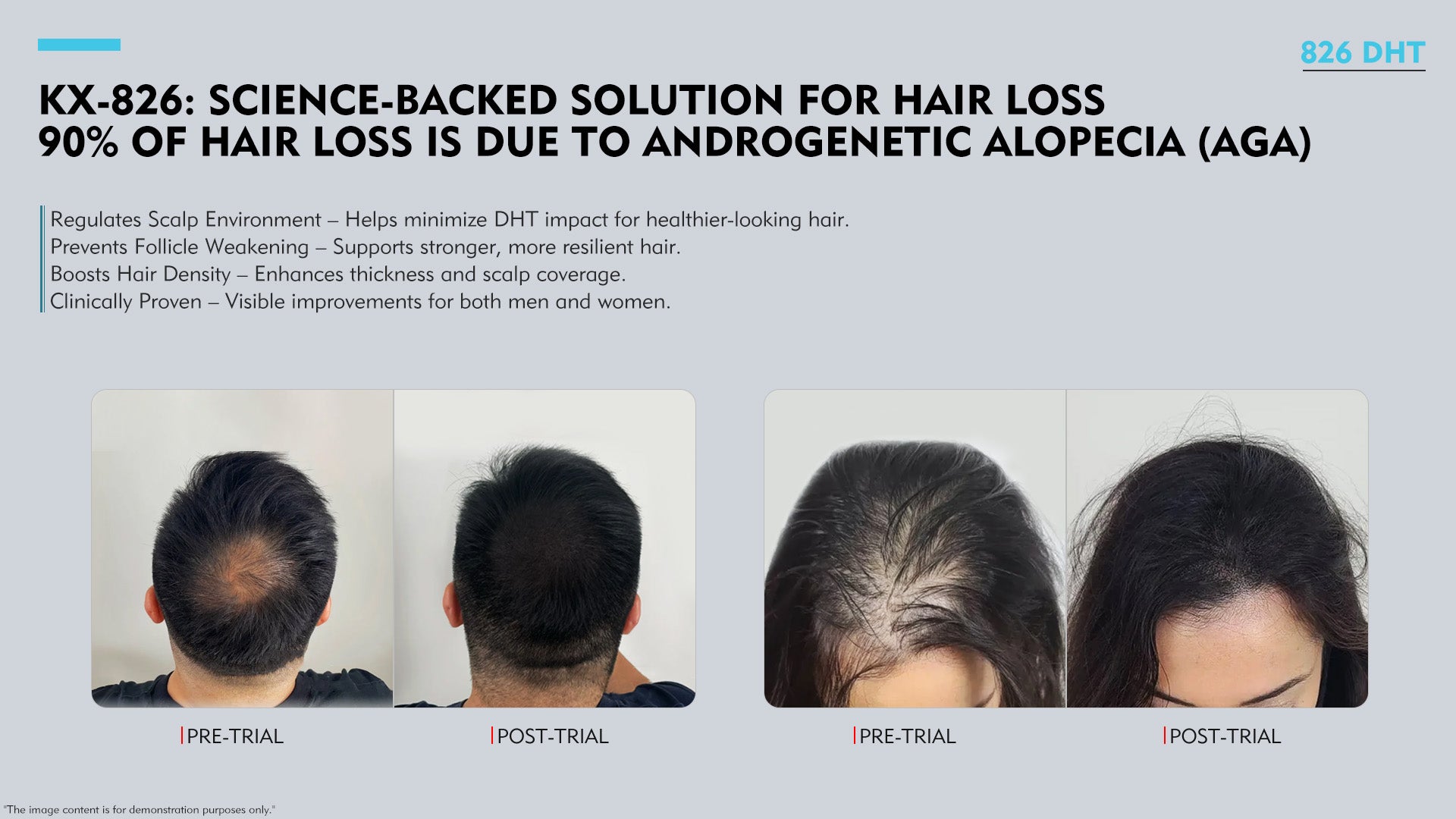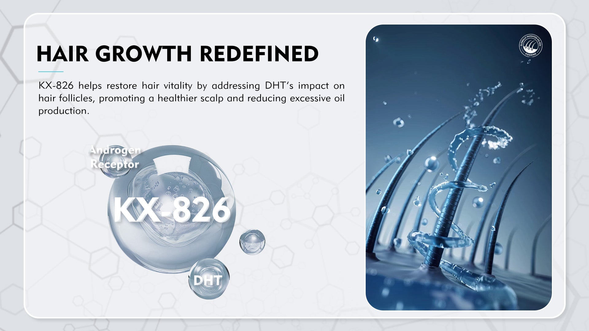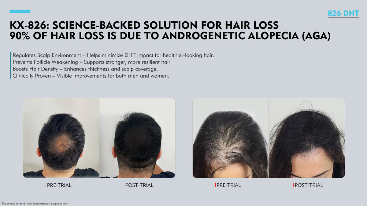 The core ingredient, 826, competes with dihydrotestosterone (DHT) for androgen receptor binding, inhibiting its impact. This restores the health of hair follicle cells, promoting healthier hair growth.