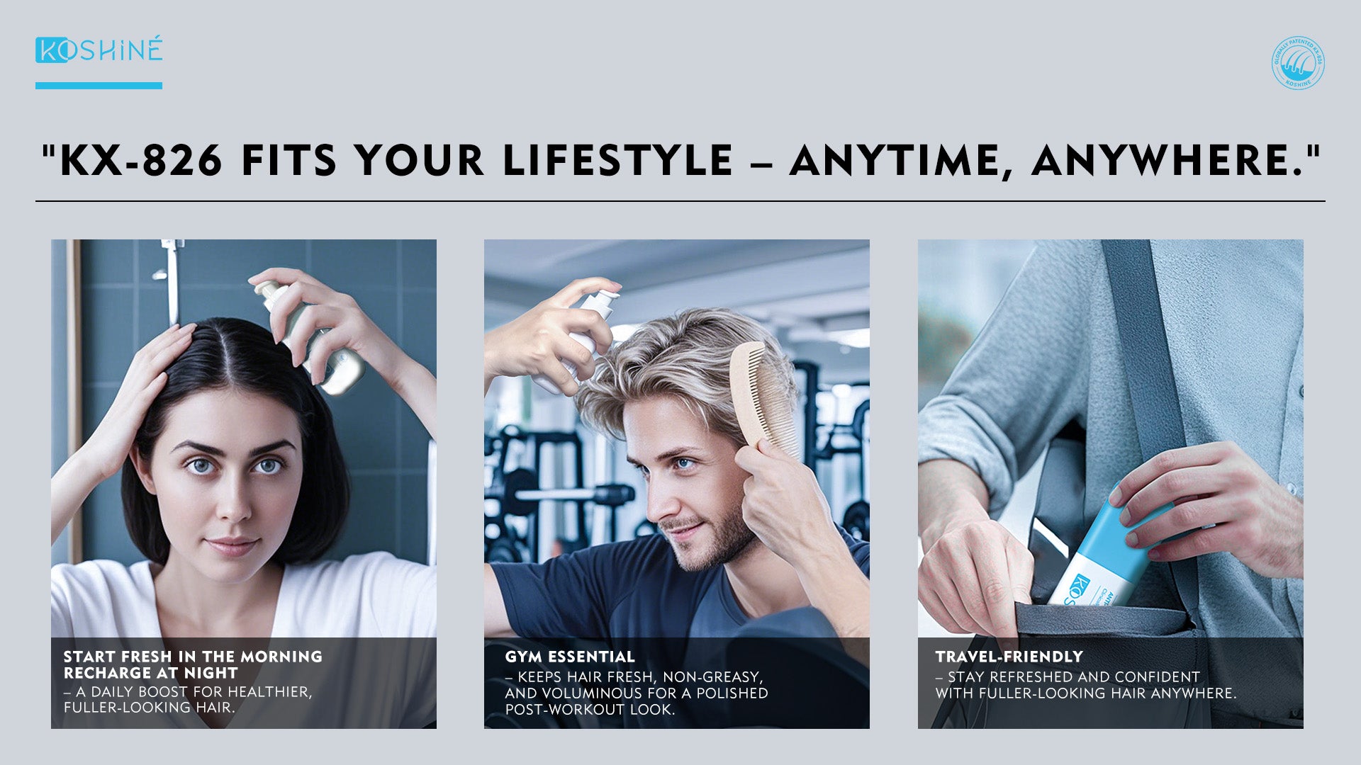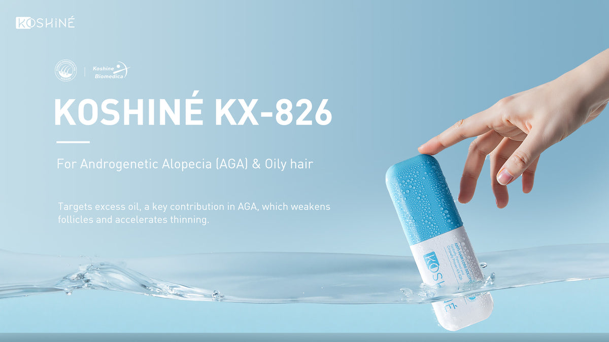 KOSHINÉ's core patented ingredient 826 has demonstrated excellent safety and efficacy in clinical research trials and can effectively improve oily hair, hair loss, and baldness. Continuous use can regulate and extend the growth cycle of hair follicles and build a healthy hair foundation.