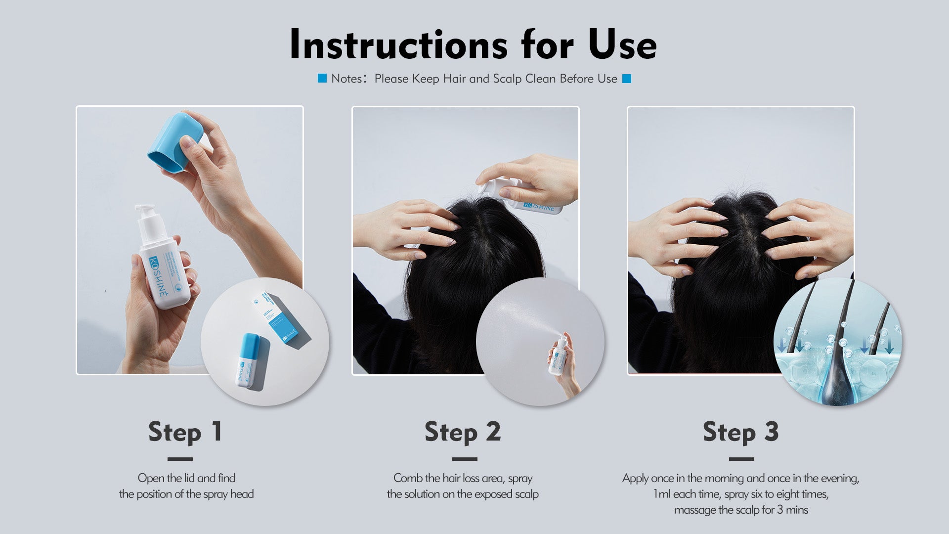 - Spray 6-8 times, about 1ml each time, and massage the scalp for 3 minutes.